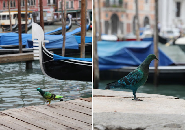 Imaginez Venise et ses places noires de monde... et de pigeons. Imaginez la place Saint-Marc. Vous la traversez et des touches de couleurs apportées par le vol de pigeons colorés animent la masse grise des essaims gris de ces oiseaux des villes, souvent considérés, avec plus de crainte ou de mépris que de plaisir, comme les « rats du ciel », des nuisibles volants.